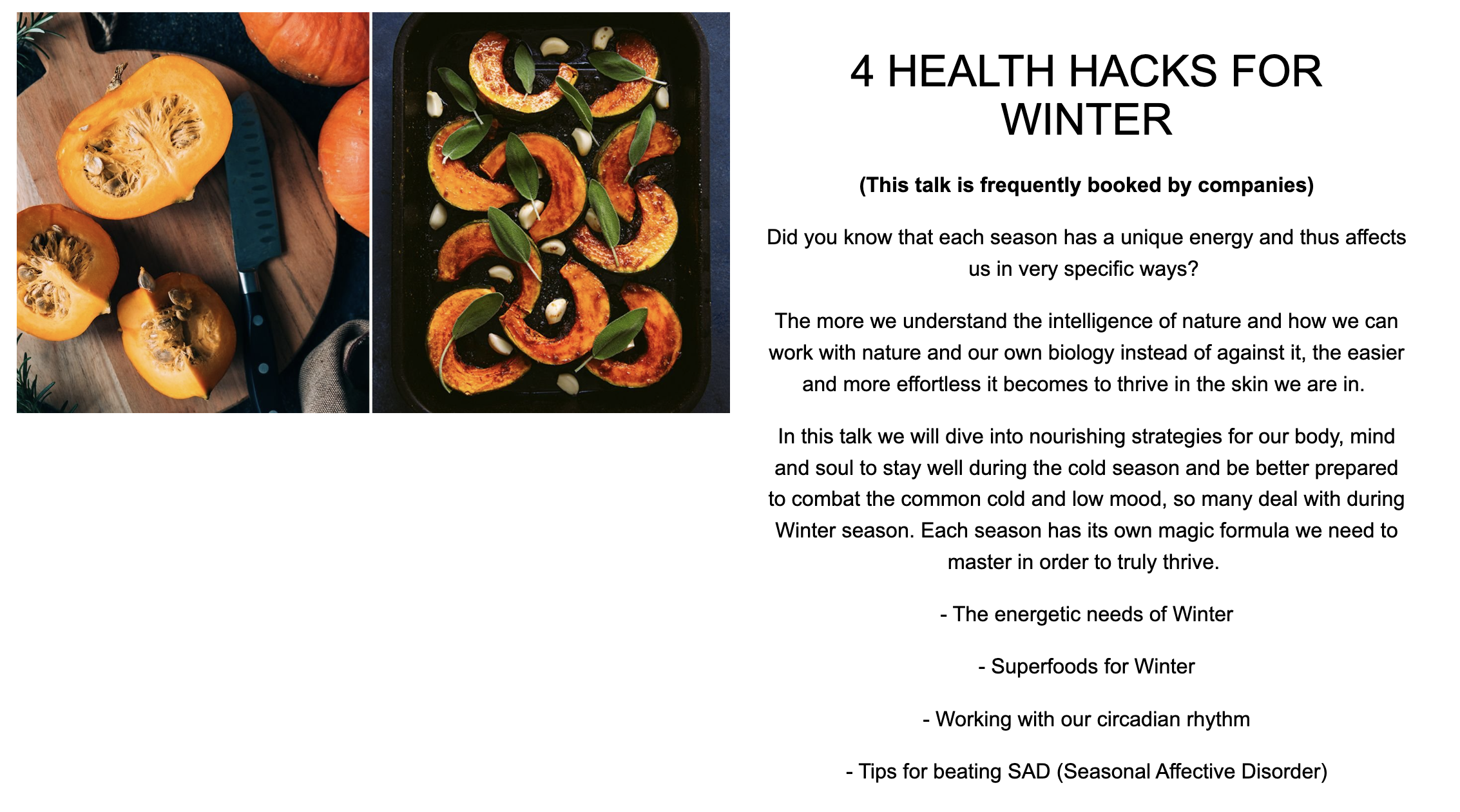 I am doing a new talk this Winter for companies. Ask your workplace to book this 60 minute talk and walk away with a better understanding of how you can work with your body and the seasons to gain effortless health and truly thrive in the body you are in.