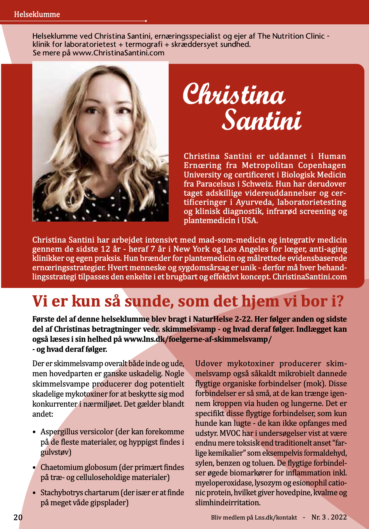 I’ve written an article based on my 10 years experience working with mold illness cases - part two of the series is out now (Danish only): Click here to read it on p 20. This article is written for the non-profit organization LNS for clients and therapists wishing to integrate conventional and holistic medicine and better transparency in health care. I recommend joining the benefits of this organization by becoming a member. You can read more about it here (Danish only): https://lns.dk/ and feel free to share.