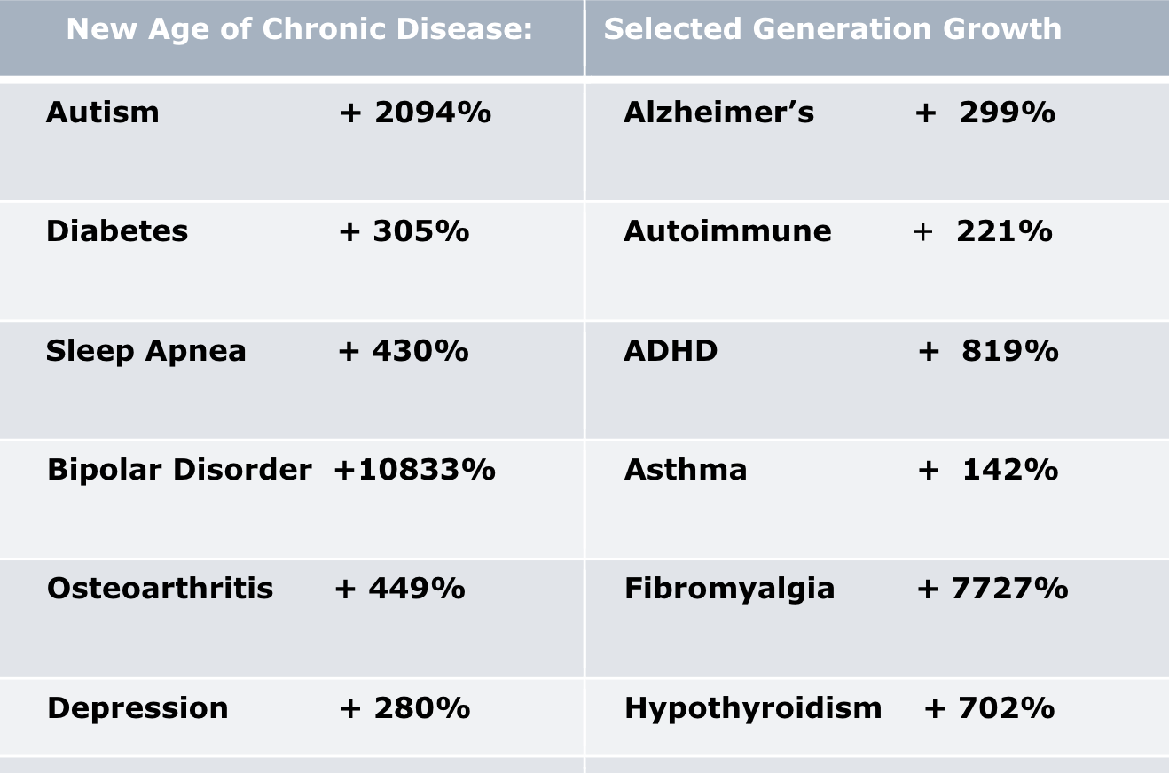 EMF exposure increases levels of peroxynitrite. Peroxynitrite is a powerful oxidant exhibiting a wide array of tissue damaging effects, including lipid peroxidation, inactivation of enzymes and ion channels via protein oxidation and nitration, and inhibition of mitochondrial respiration (Virag et al., 2003). In a single generation, there has been a dramatic acceleration in the prevalence of diseases and disorders like autism (2094%), Alzheimer’s (299%), COPD (148%), diabetes (305%), sleep apnea (430%), celiac disease (1111%), ADHD (819%), asthma (142%), depression (280%), bipolar disease in youth (10833%), osteoarthritis (449%), lupus (787%), inflammatory bowel disease (IBD –120%), chronic fatigue syndrome (11027%), fibromyalgia (7727%), multiple sclerosis (117%) and hypothyroidism (702%). Click on to read the full study.